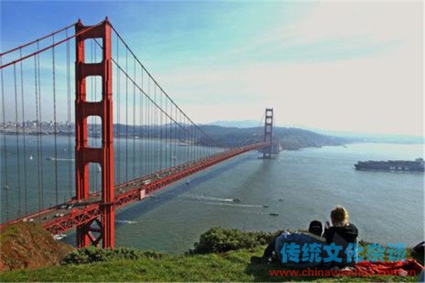2.金门大桥——金门大桥的结构是世界上最漂亮的结构之一。金门大桥的巨大桥塔高227米,每根钢索重6412吨,由27000根钢丝绞成。1933年1月始建,1937年5月首次建成通车。