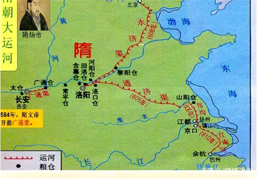 二、修建山阳渎(沟渠、水道):自山阳引淮水至江都(今江苏扬州)的水道,即是春秋末期吴国开凿的邗沟旧道。隋文帝于587年曾在此基础上修建山阳渎,605年隋炀帝征发淮南十几万人民,对山阳渎进行疏通,扩大。
