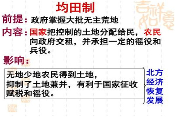 西晋末年,中国北方在长期战乱之后,户口迁徙,土地荒芜,国家赋税收入受到严重影响。为保证国家赋税来源,北魏孝文帝采纳大臣李安世的建议,于太和九年(485)颁行均田制,主要规定: