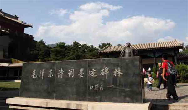 碑林根据毛泽东同志创作这些诗词时间的先后,分为青少年时期,大革命时期,抗日战争时期,解放战争时期和新中国成立后等五个景区。碑林之大,碑块之多,雕塑之精,造型之最,建筑之好,均属世界罕见。尤其是其中的《七律•到韶山》,高8.3米,宽12.26米,厚0.99米,可称当今中国最大的、最有气势的刻碑。