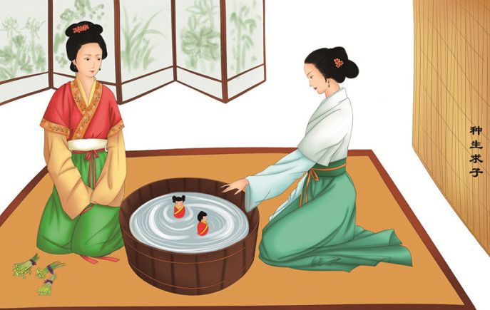 旧时习俗,在七夕前几天,先在小木板上敷一层土,播下粟米的种子,让它生出绿油油的嫩苗,再摆一些小茅屋、花木在上面,做成田舍人家小村子的模样,,称为“壳板”,或将绿豆、小豆、小麦等浸于磁碗中,等它长出敷寸的芽,再以红、蓝丝绳扎成一束,称为“种生”,又称为“五生盆”或“生花盆”。南方各地也称为“泡巧”,将长出的豆芽称为巧芽,甚至以巧芽取代针,抛在水面乞巧。还用蜡塑各种形象,如牛郎、织女故事中的人物,或秃鹰、鸳鸯、等动物之形,放在水上浮游,称之为“水上浮”。又有蜡制的婴儿玩偶,让妇女买回家浮于水土,以为宜子之祥,称为“化生”。