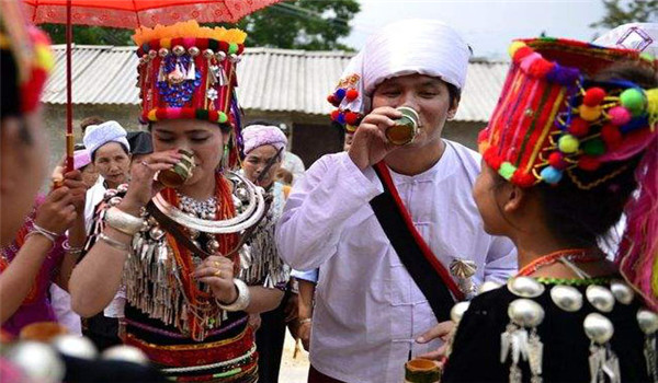 婚礼。新媳妇被接到男方村寨后,不能直接进入男方家,首先要在媒人格萨家落脚一夜。据说,这样可以免除姑娘把娘家的鬼魂神灵带到男方家里。举行婚礼时,首先由两名敬酒人向在媒人家休息的新娘敬四次酒。第一次表示欢迎新娘的到来,第二次表示请新娘好好休息,第三次表示请吃好饭,第四次表示已准备周全,请新娘到新郎家。