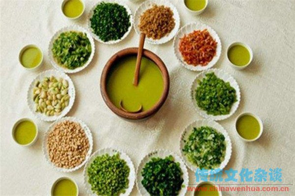 擂茶的制作十分奇特,先把生姜、生米、生茶叶等原料按一定比例倒入陶制的擂钵中,以三四尺长的木质擂棒用力擂碾,捣至糊状,然后加入清水,调和成奶白色的汁液,入锅煮沸,就制成了清凉爽口的擂茶。