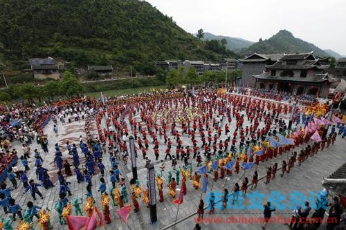 祭祀毕,牛角号声吹响了,鼓乐齐鸣,炮声震天,各路队伍踏着锣鼓节拍,跳起摆手舞,场面宏伟壮阔。