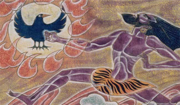 汤谷里有一棵非常奇怪的扶桑树,它的两棵巨大的枝干生长在同一个树蔸上。太阳女神规定十个太阳轮流上班,一个爬在树上时,其他九个就泡在扶桑树下的水里;只有当一个太阳在天上值完班,回到汤谷休息时,另一个才能出去。太阳女神不辞劳苦,每天驾着由六条蛟龙拉的太阳车,亲自护送她的孩子去上班。所以每天人们只能看见一个太阳。