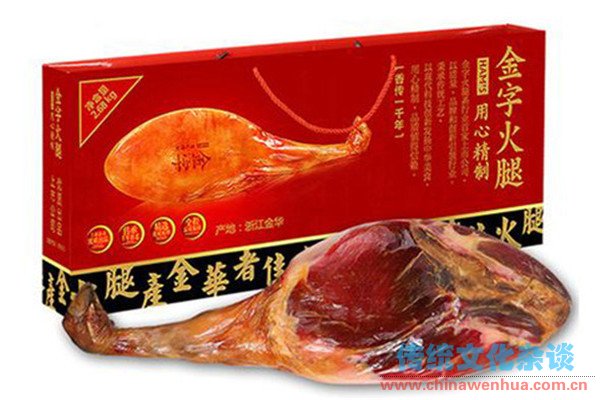 金华火腿皮色黄亮,香冽清醇,味鲜脆嫩,形如竹叶,以色,香、味、型“四绝”而闻名于国内外市场。早在1915年巴拿马国际博览会上就获得过商品一等奖。